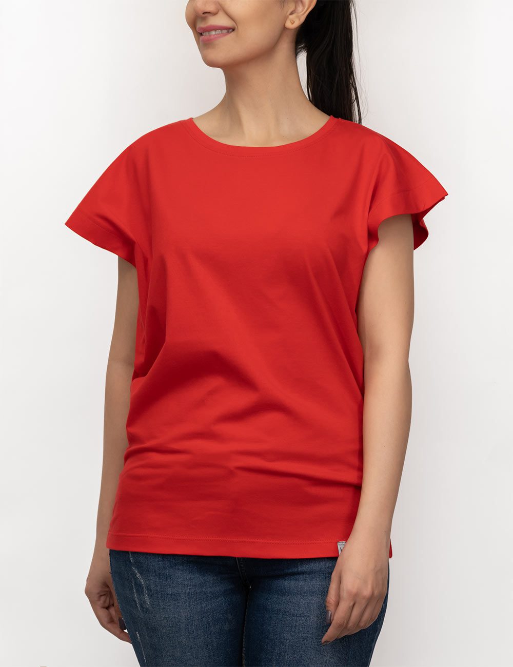 تیشرت زنانه سرشانه افتاده سانیا از جنس پنبه صد در صد تولید شده است.
